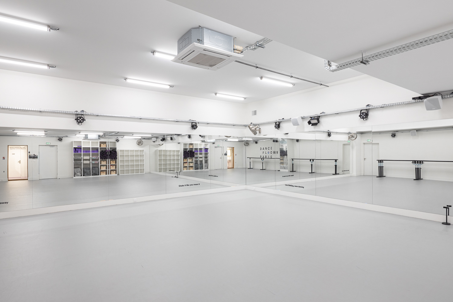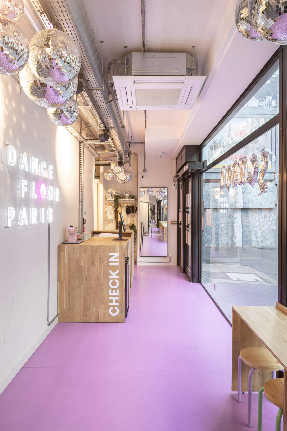 Pour la création du deuxième studio de danse parisien de Dancefloor Paris, rue de la Boétie à Paris 08, nous avons créé un nouvel ERP dans une ancienne supérette.