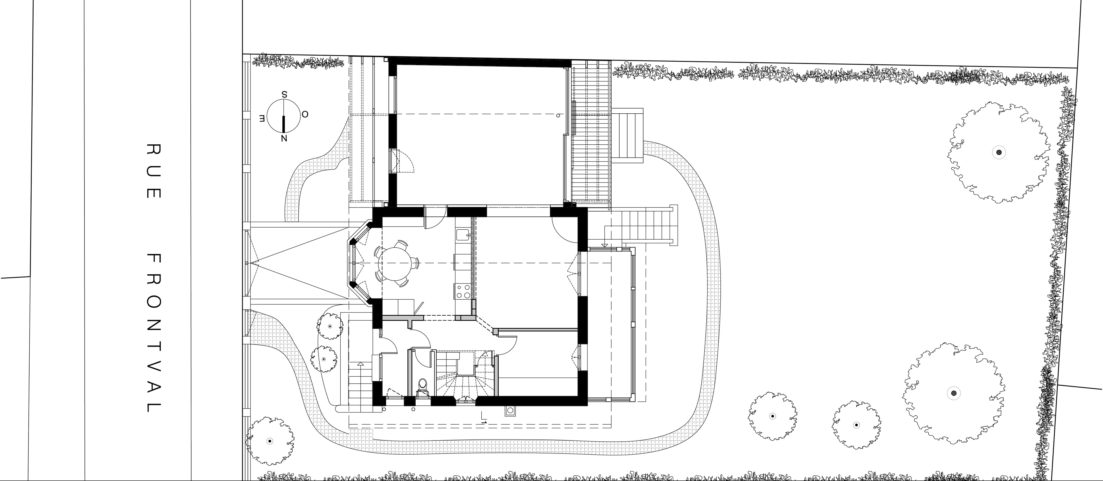 Cette extension de maison se situe sur la commune de Viroflay. La maison existante est un pavillon type «meulière» des années 30. Comme tout projet de ce type, l’enjeu est de concilier le traitement d’une architecture contemporaine associée à une architecture traditionnelle, qui présente ici un caractère affirmé. Notre approche a consisté à poursuivre le volume existant en poursuivant la toiture. Ensuite nous avons choisi de dessiner des façades contemporaines qui jouent avec les faux colombages existants. Le faux colombage devient support de végétation sur la façade rue et un brise soleil sur la façade jardin exposée à l’ouest. C’est une manière de revisiter le dessin du colombage et de l’image traditionnelle du pavillon, sur lequel courent les plantes grimpantes. Il protège l’intimité des espaces intérieurs côté rue et protège les apports solaires importants sur le séjour façade ouest.