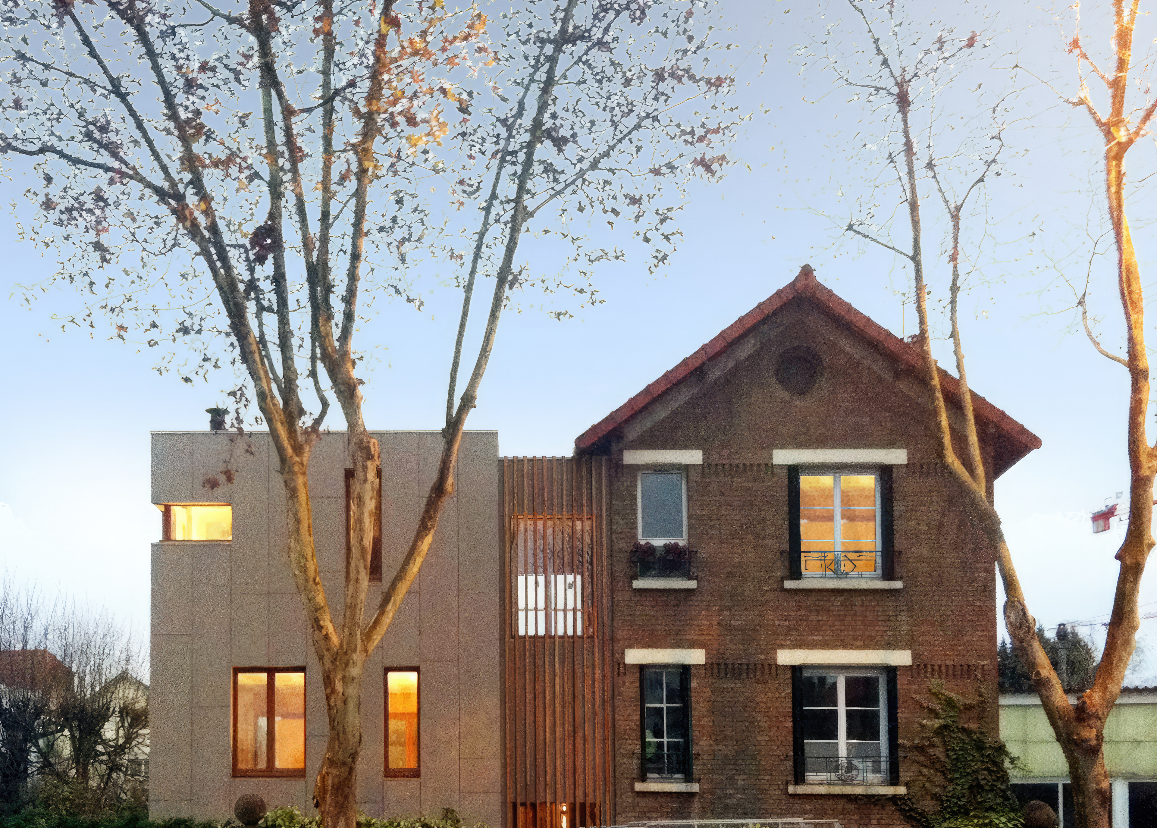Nous n’avons pas abordé ce projet par mimétisme, la nouvelle partie de la maison s’inscrit dans les préoccupations de son époque. Elle se ferme sur rue au nord et s’ouvre sur le jardin au sud. Construite en mur ossature bois sur un RDC maçonné, elle est habillée de panneaux d’Eternit pour répondre à son environnement urbain. De fait, très différente du pavillon existant, elle y est reliée par les nouvelles circulations verticales, communes aux 2 parties, dont les façades sont habillées d’un bardage en chevron de douglas.