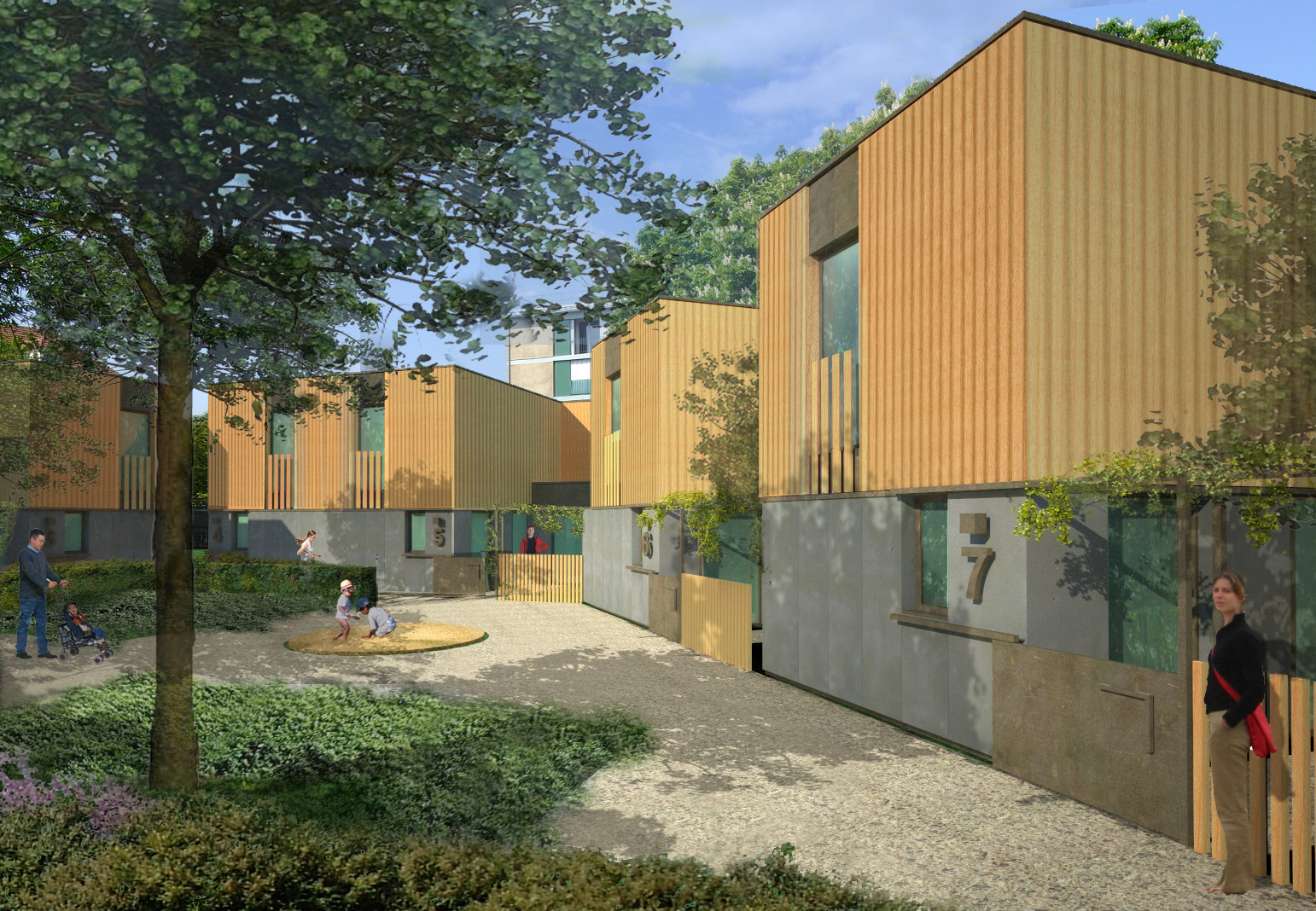 Ce projet BBC de 9 maisons bois cherche à concilier la dimension individuelle de la maison et la qualité d’un espace public. Les deux sont pensées avec une même attention afin de préserver l’équilibre fragile du tissu social dont la ville se doit d’être à la fois le garant et le vecteur. Inscrit dans les préoccupations environnementales de son époque ce projet privilégie l’usage piéton du site le libérant de l’omniprésence de l’automobile. Il offre alors de nouveaux lieux d’usage aux habitants pour qui l’extérieur devient un prolongement de la sphère privée de la maison.